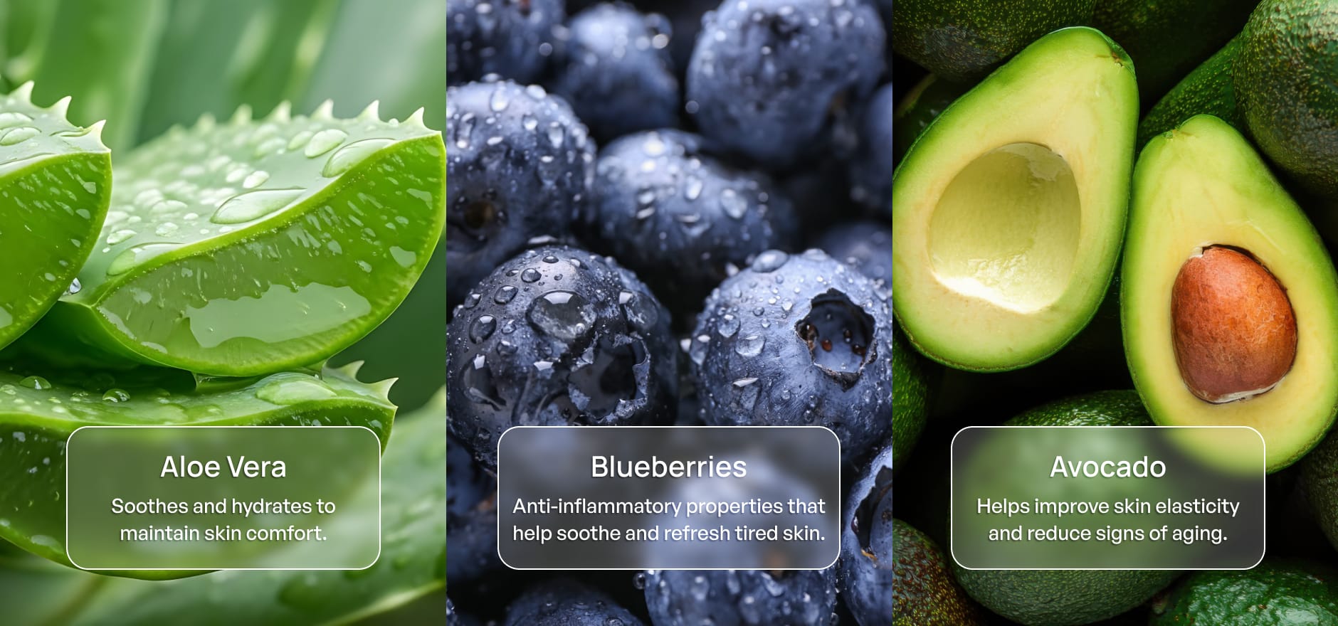 Enriched with Aloe Vera, it hydrates and soothes irritation, helping to calm redness and support healing for sensitive skin. Infused with Avocado extract rich in omega-3 fatty acids, it deeply nourishes, improves elasticity, and helps reduce the appearance of fine lines, leaving the skin clear, smooth, and revitalized.