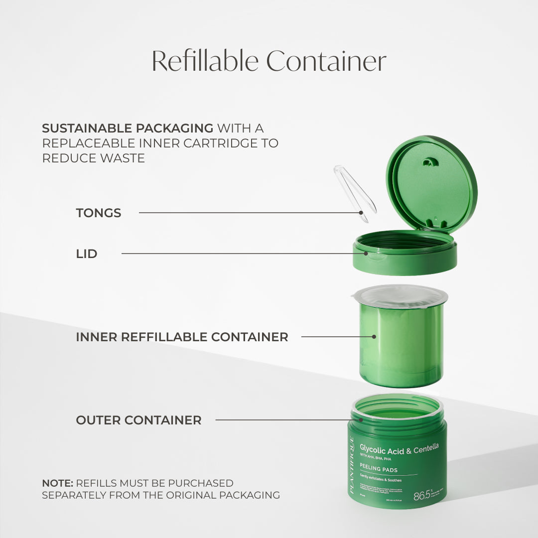 The Centella peeling pads come in a refillable packaging reflecting our commitment to sustainability. The eco-friendly design lets you easily refill your pads while reducing waste, making it simple to care for both your skin and the planet. Each durable container is built to last, and the included tongs ensure a hygienic, mess-free experience every time.