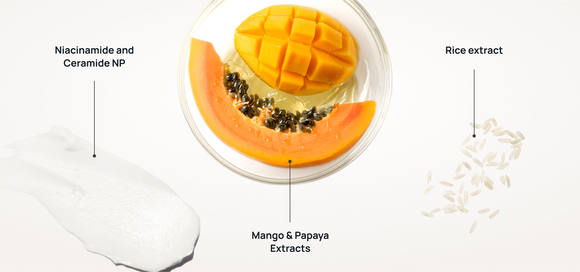Ethylhexyl Palmitate, Ethylhexyl Stearate, Synthetic Wax, Polyglyceryl-2 Caprate, Polyglyceryl-6 Dicaprate, Sorbitan Sesquioleate, Mangifera Indica (Mango) Fruit Extract, Sodium Hyaluronate, Carica Papaya (Papaya) Fruit Extract, Centella Asiatica Extract, Ceramide NP, Soluble Collagen, Phenoxyethanol, Olea Europaea (Olive) Fruit Oil, Polyglyceryl-10 Oleate, Ethylhexylglycerin, Squalane, Butyrospermum Parkii (Shea) Butter, Aqua/ Water/ Eau, Tocopherol, Butylene Glycol, Oryza Sativa (Rice) Bran Oil, Niacinamide, Glycerin, Caprylic/Capric Triglyceride, 1,2-Hexanediol, Avena Sativa (Oat) Meal Extract, Hydrogenated Lecithin, Persea Gratissima (Avocado) Fruit Extract, Oryza Sativa (Rice) Bran Extract, Oryza Sativa (Rice) Extract, Prunus Persica (Peach) Fruit Extract, Vaccinium Angustifolium (Blueberry) Fruit Extract, Houttuynia Cordata Extract, Mannose, Glucose.