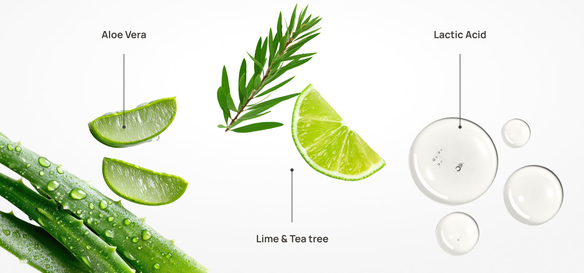 Aqua, Alcohol, Butylene Glycol, Lactic Acid, Citric Acid, Salicylic Acid, Glycerin, Aloe Barbadensis (Aloe Vera) Extract, Fragaria Vesca (Strawberry) Fruit Extract, Triethanolamine, Glycolic Acid, Parfum.