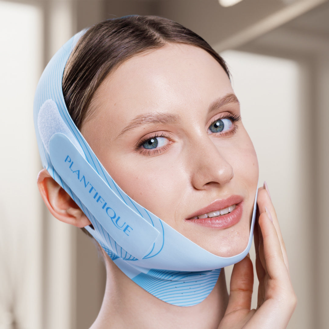 For the final lift, wear the Chin Strap for 30-60 minutes. This step locks in the contouring effect, offering a lifted, snatched jawline and smooth neck.